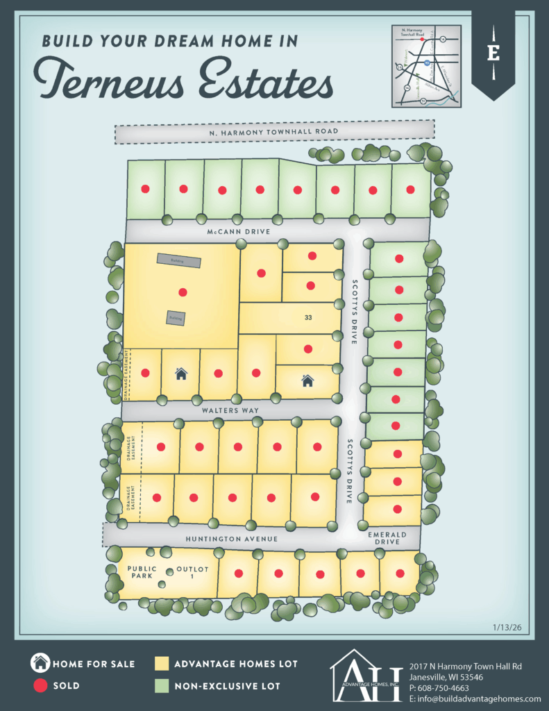 Terneus Estates is conveniently located off Huntington Avenue in Janesville. Terneus Estates consists of a 20-acre parcel with a total of 44 single-family home sites. Located in Janesville’s growing northeast side, this subdivision offers convenient access to nearby schools, parks, and I-90, as well as close proximity to shopping in Pine Tree Plaza and along Milton Avenue.