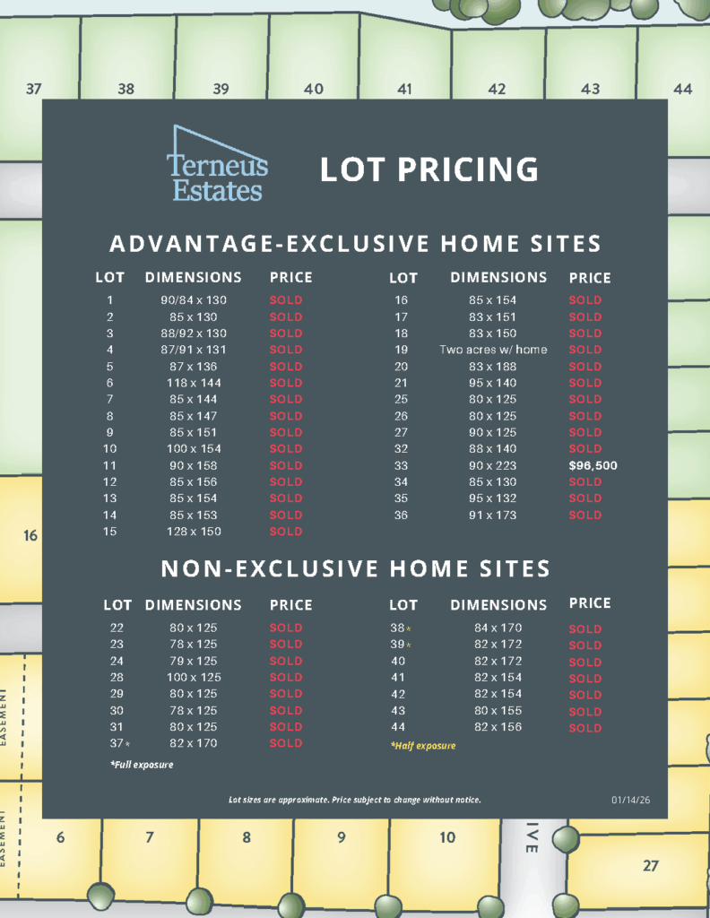 Find the perfect Terneus Estates home site for you. A plat map and pricing can be found below.